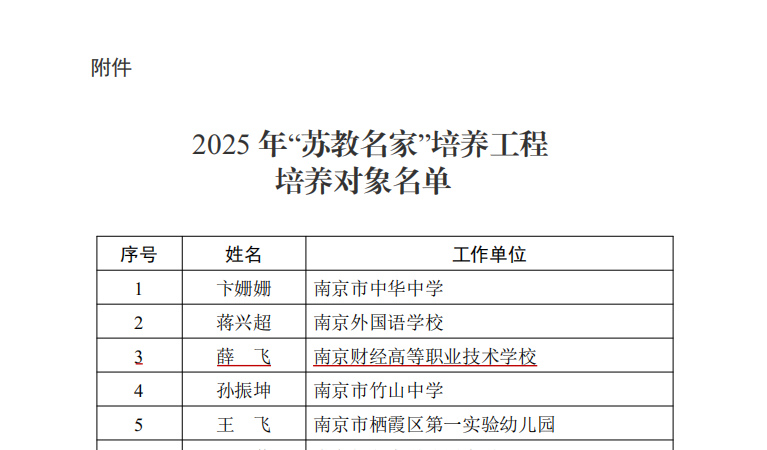 日前,江苏省教育厅发布了《2025年“苏教名家”培养工程培养对象名单》公示文件,我校副校长薛飞成功入选,成为本批次培养对象。