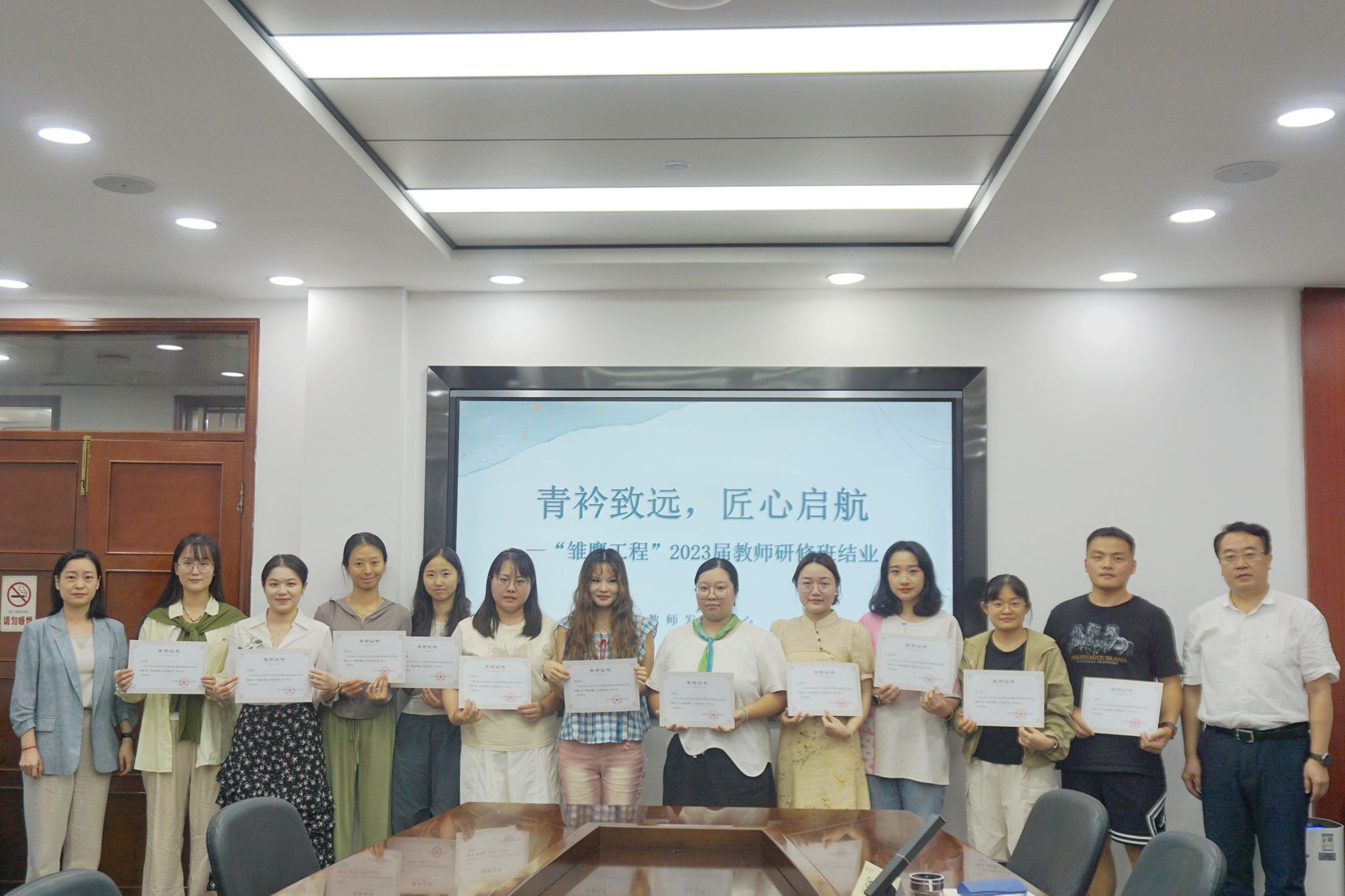 吴佳永从师德引领、教学改革、科研实践、团队历练等四个方面回顾了2023年“雏鹰工程”教师研修班学员的成长历程及取得的实践成果。随后,2023年“雏鹰”班学员依次进行个人研修总结,分享两年来自己的收获和成长。大家对老教师们的热心帮助以及学校的鼎力支持表示感谢。姚峰和杨宇净为全体结业学员颁发结业证书。