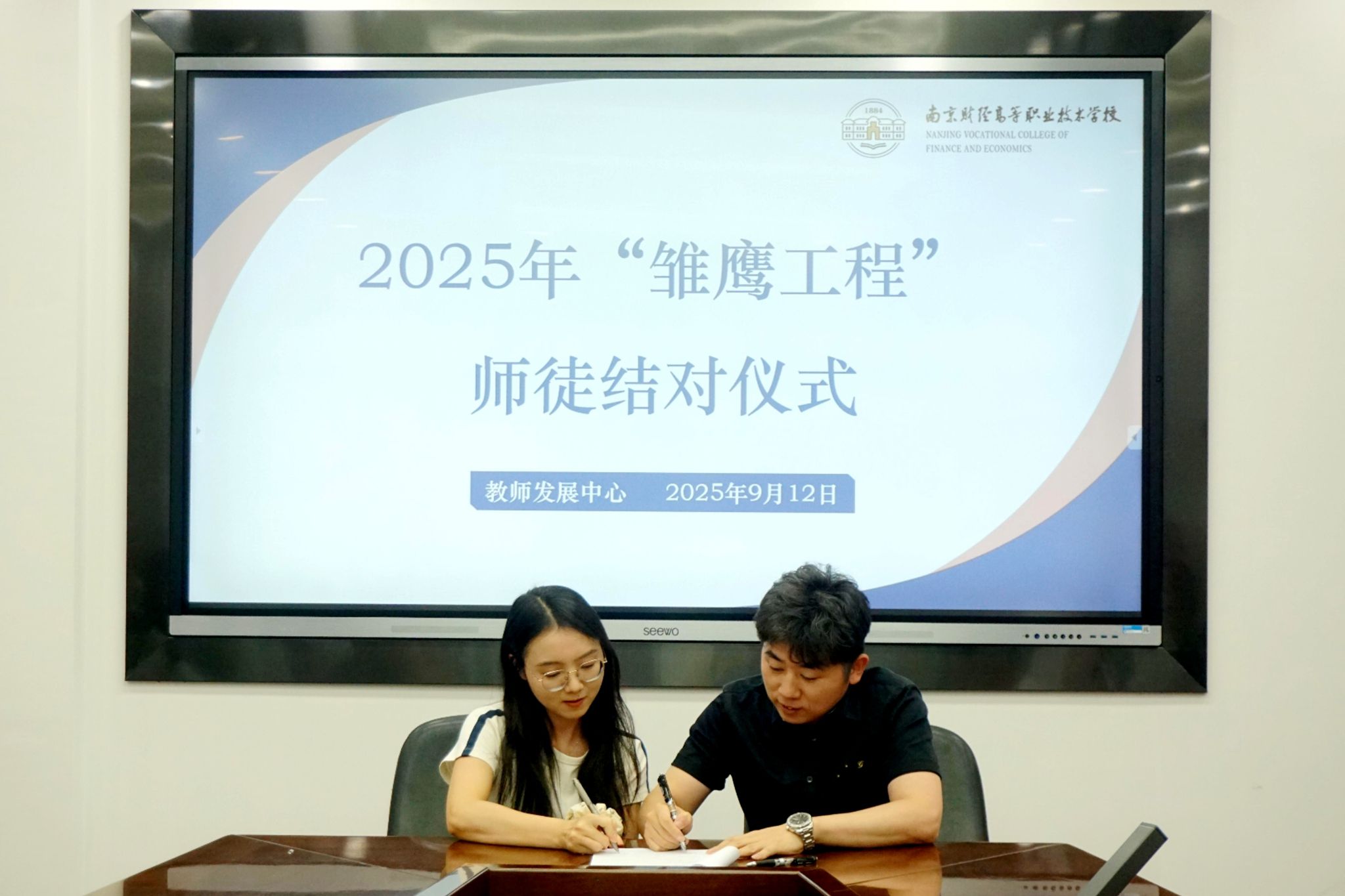 9月12日,我校2023“雏鹰工程”教师研修班结业典礼暨2025“雏鹰工程”师徒结对仪式在莫愁路校区举行。校党委书记、校长姚峰,副校长杨宇净,教师发展中心主任陈琴芳出席活动。活动由教师发展中心副主任吴佳永主持。