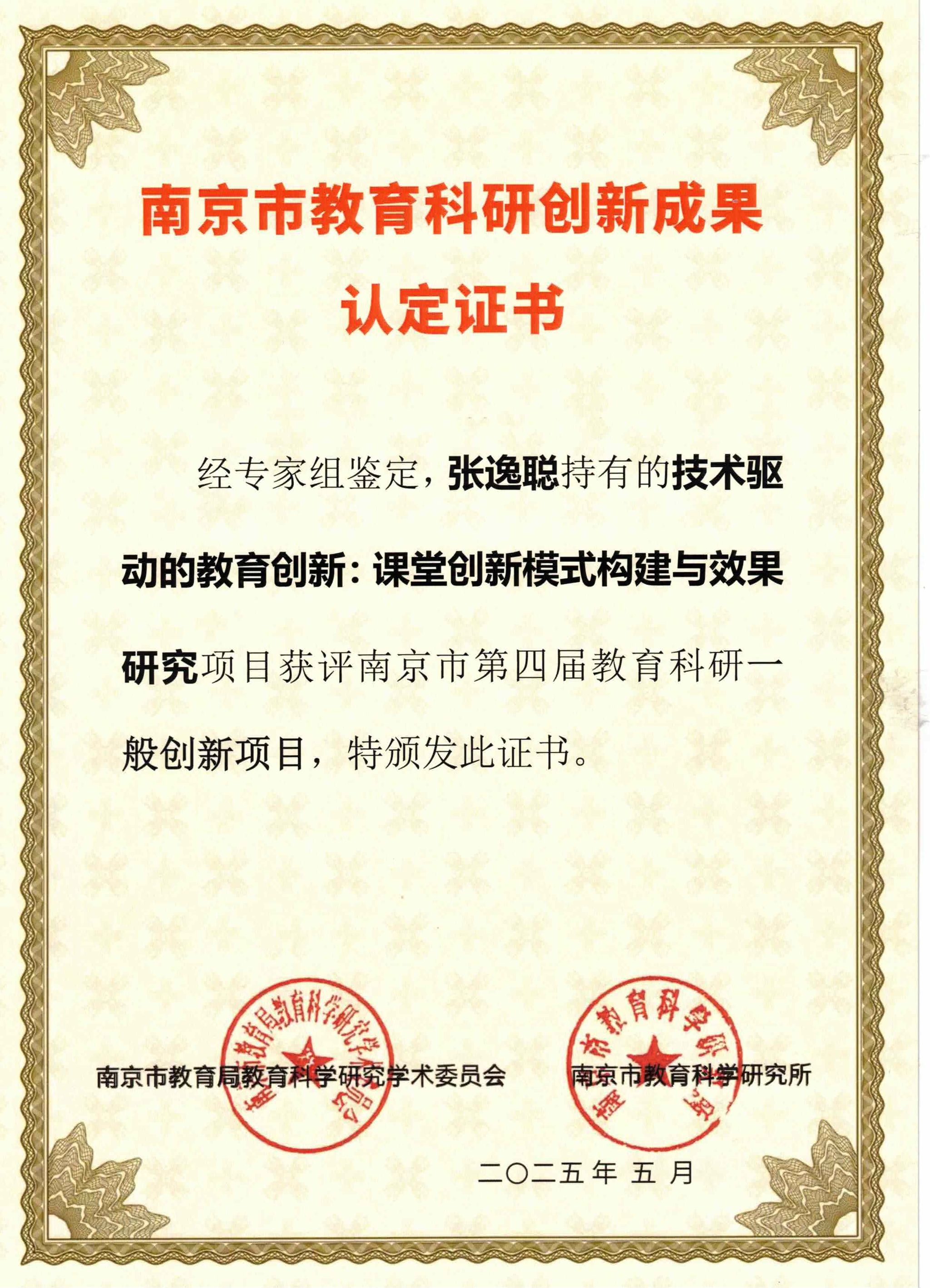 12月11日,南京市教育科学研究所下发了“南京市第四届教育科研成果创新奖”的认定证书,我校张逸聪老师的《技术驱动的教育创新:课堂创新模式构建与效果研究》项目凭借鲜明的创新性和显著的实践价值,成功获评南京市第四届教育科研一般创新项目。